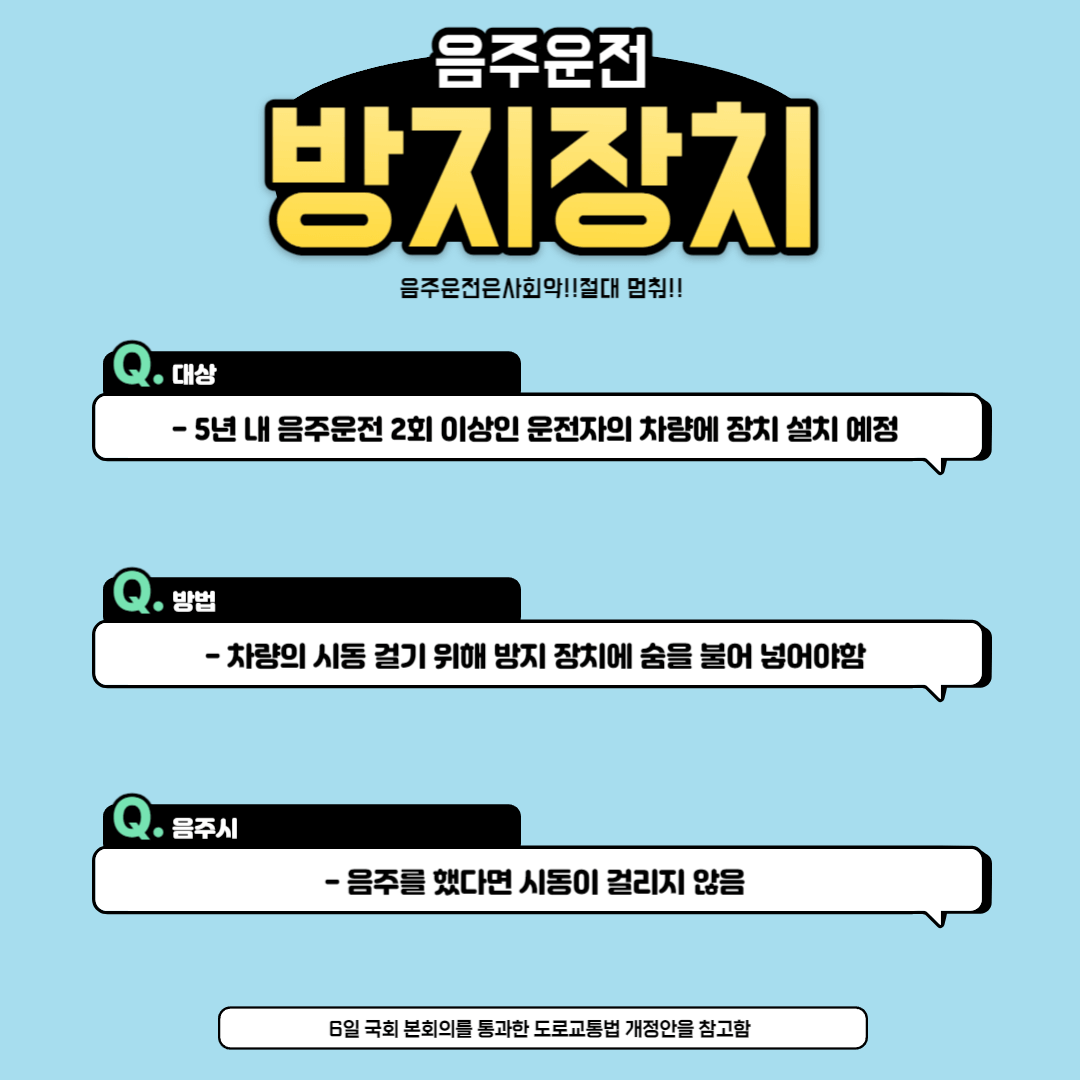 - 5년 내 음주 운전 경력이 2회 이상인 음주 운전자의 차량에 방지 장치 설치 예정