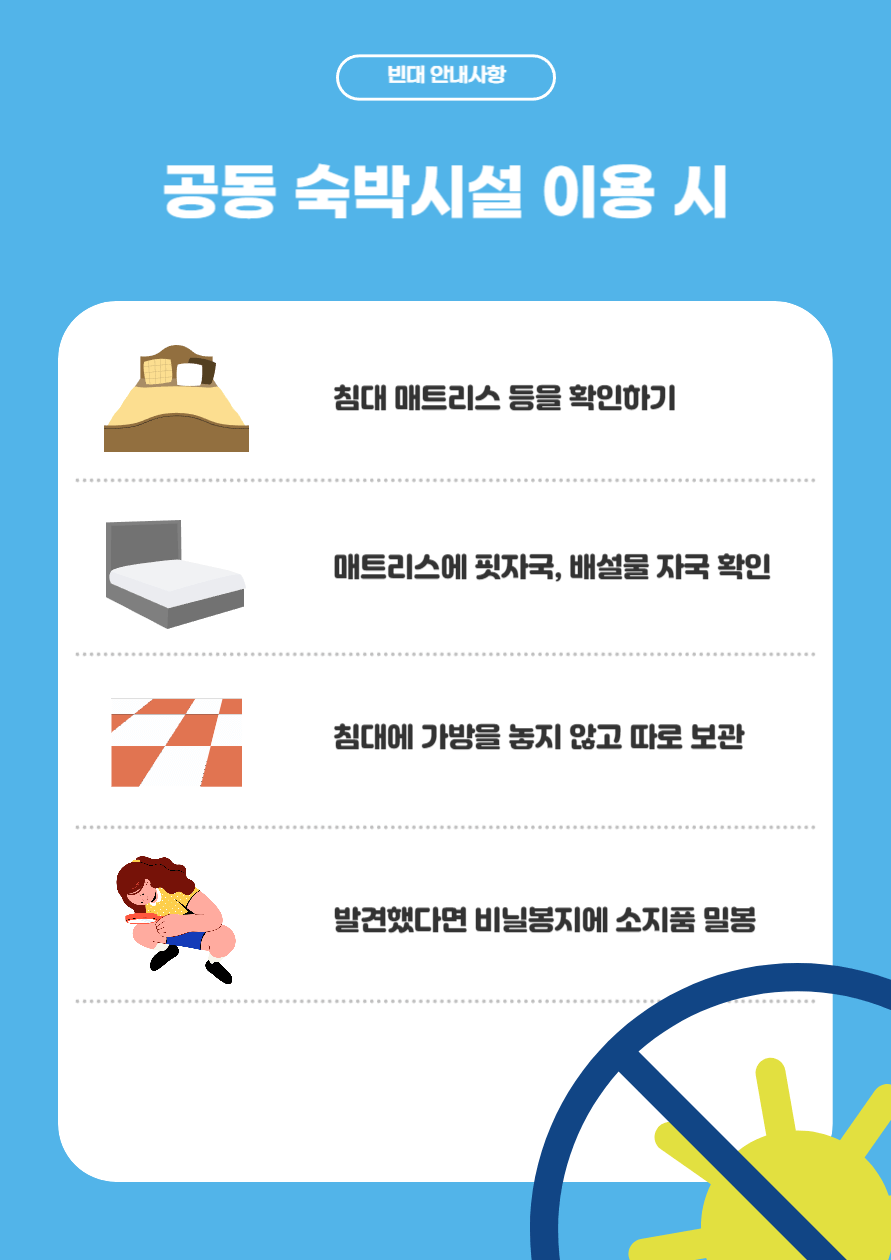 - 빈대가 보이지 않더라도 방바닥 또는 침대에 짐이나 가방을 놓지 않고 따로 보관해주세요.